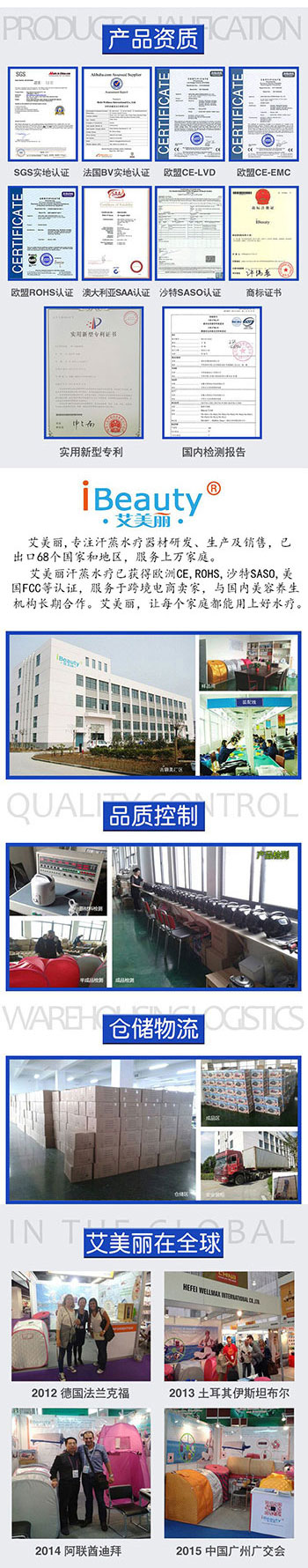艾美丽/iBeauty, 源自德国的水疗,汗蒸箱等已获得欧盟CE、ROHS、REACH,沙特SASO,澳洲SAA等国际认证, 畅销欧盟、中东、澳洲、东盟等68个国家和地区,通过亚马逊,Jollychic, Lazada, Aliexpress速卖通等,已服务海外上万家庭; 在国内, 线上通过天猫、JD、淘宝等建立了旗舰店和分销网络,自建艾美丽水疗馆服务线下客户, 已与务于时尚妈咪、怡安娜、月子印象、大宋等产后月子中心及美容院。