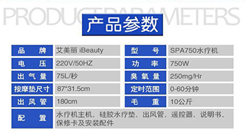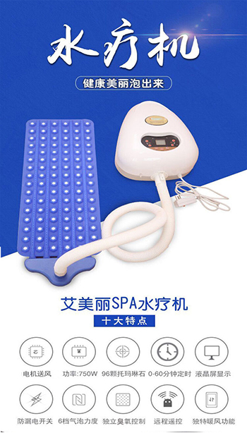 艾美丽儿童水疗机搭载500W电机提供风力,集超音波、远红外线功能、臭氧功能、推拿与一体,利用水的物理特性,通过拍打全身,已达到身心灵的放松。